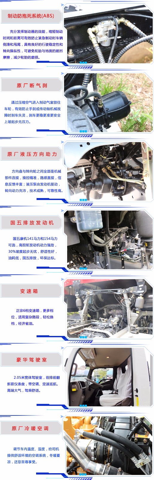 底盤配置:該車才用福田康明斯154馬力發(fā)動機(jī)(歐五排放標(biāo)準(zhǔn)帶尿素罐),6檔手動變速箱,3800mm軸距,7.50R16鋼絲胎,氣剎,帶冷熱空調(diào),帶離合器助力,帶方向助力,帶定速巡航功能,2.05米寬體駕駛室??傎|(zhì)量:7噸,車身自重4.8噸。